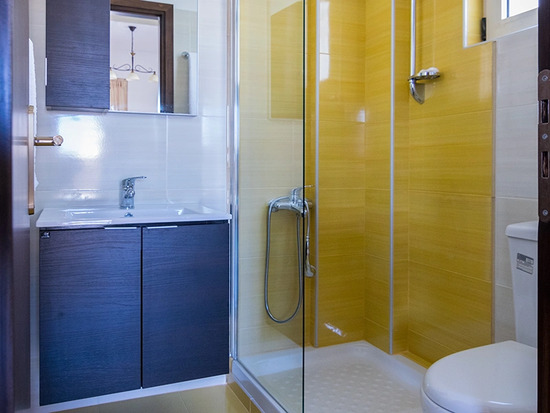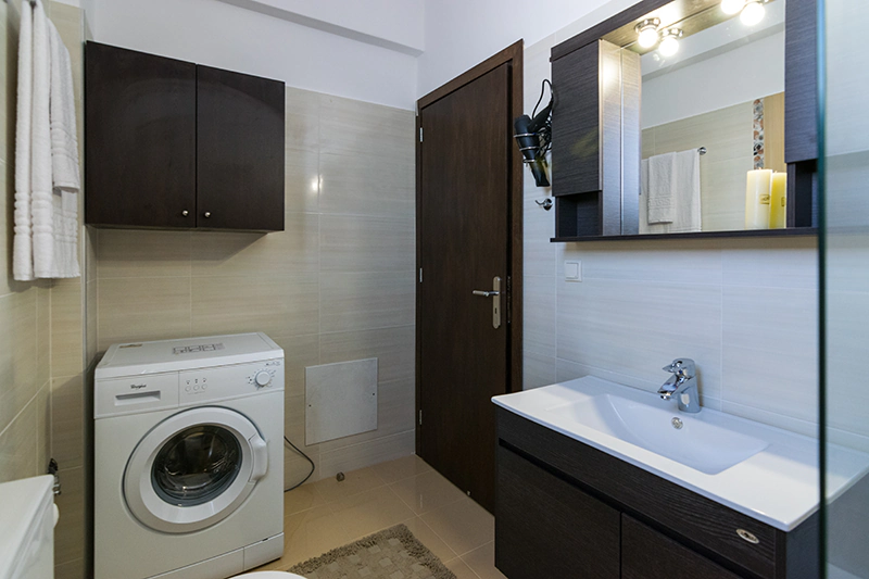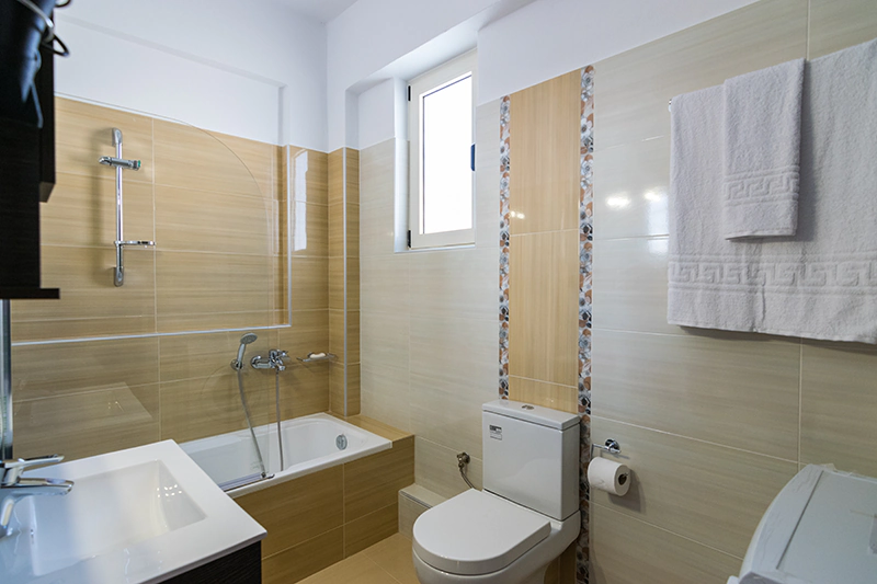 On the first floor there are two bedrooms and a bathroom with a bathtub and a washing machine. The first bedroom has one double bed and a door leading to a big terrace with a modern wooden pergola, perfect for relaxation. The second bedroom has 2 single beds that can be turned into a double bed, if requested and a door opening out on to a pergola covered terrace with nice view, as well as a second door leading to a small balcony. Both rooms are air conditioned and have flat screen TVs.